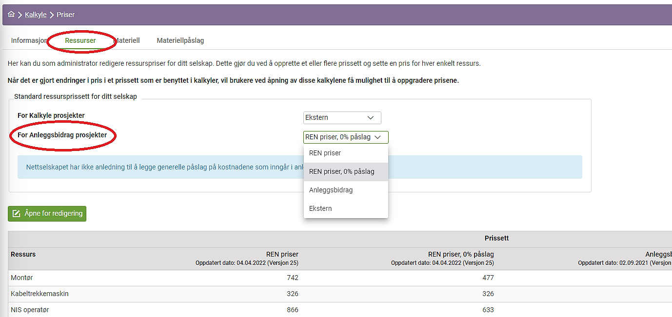 På grunn av retningslinjene og forskriftene fra RME i forhold til bruk av påslag i kalkylene for anleggsbidrag, var det tidligere alltid RENs ressurspris med 0% som ble valgt når en startet en ny kalkyle. Dette er forankret i forskrift om kontroll av nettvirksomhet § 16-6. Anleggskostnad .Det har imidlertid vært ønskelig å kunne styre hva som er standard når en benytter selskapskalkyle. Vi har nå lagt inn funksjonalitet for dette.