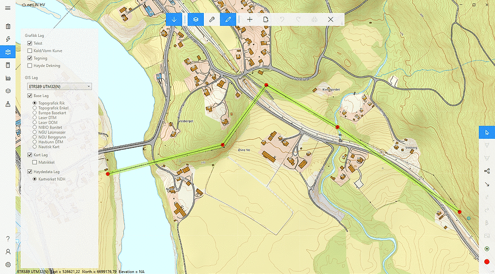 I Netlin 4 Plan kan du tegne traséen din direkte i kartet. Programmet utarbeider automatisk en detaljert terrengprofil, som hjelper deg med korrekt stolpeplassering i terrenget.