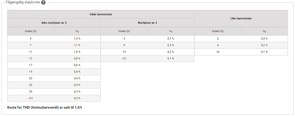 Utdrag av beregningsresultatene vises direkte i verktøyet - både i form av søylediagram og en mer detaljert tabell. Fullstendig resultat kan eksporteres til en PDF-rapport som viser både inndata og resultater i form av kvoter for tillatte overharmoniske strømmer og spenninger.