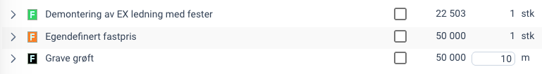 Det oransje ikonet indikerer den tradisjonelle fastpriskoden i Kalkyle som man legger inn manuelt i prosjektet. Det sorte ikonet indikerer selskapsvise fastpriser, som er hentet fra et selskapsbibliotek for fastpriskoder. Dette er tidligere omtalt i denne artikkelen. Det siste som nå er tilgjengelig er import av fastpriskoder i et prosjekt. Altså fastpriskoden som har et grønt ikon.