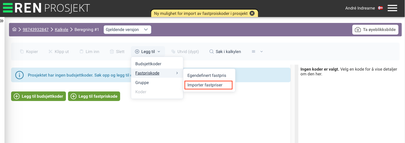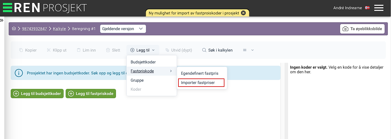 Ny funksjon i Kalkyle: Import av fastpriskoder i prosjekt