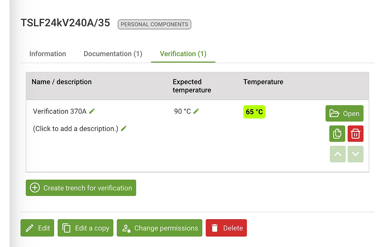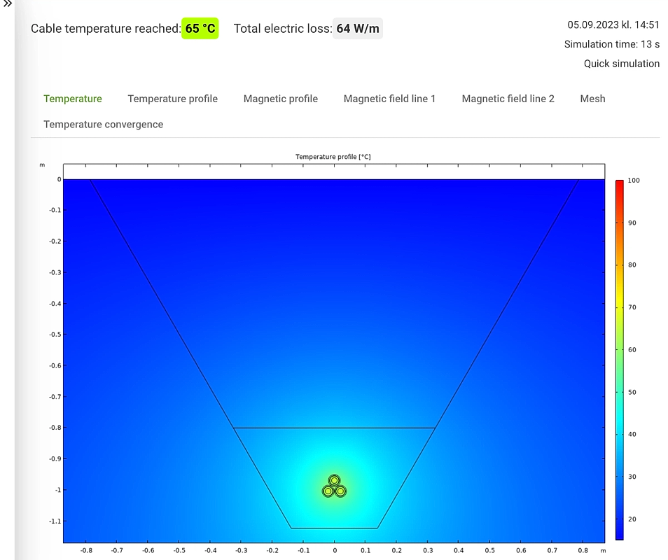 Når du designer en kabel, er det viktig å verifisere designet. Under verifikasjonsfanen i Kabeldesigneren kan du lage simuleringer som verifiserer kabeltemperaturen for en gitt strømstyrke.