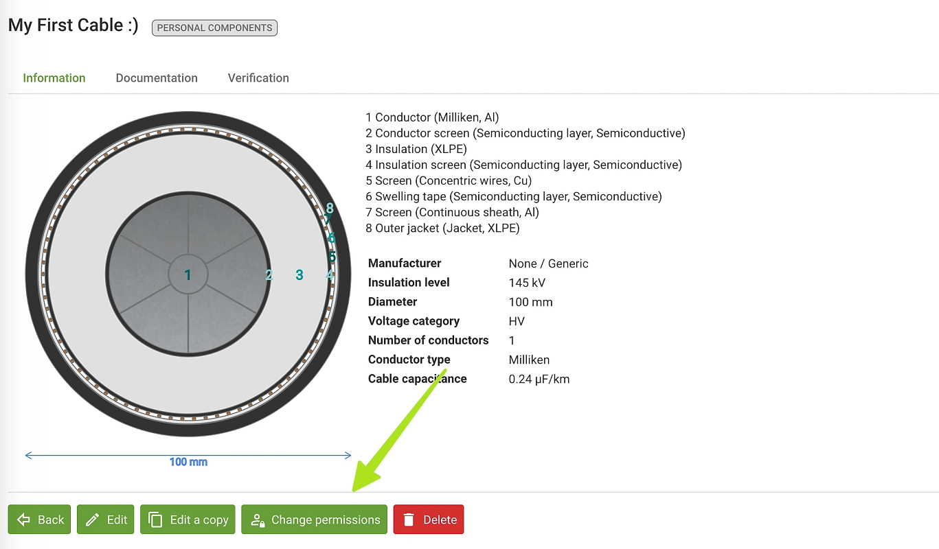 Komponenten kan deles med andre ved å klikke på "endre tillatelser". Komponenter er private som standard.
