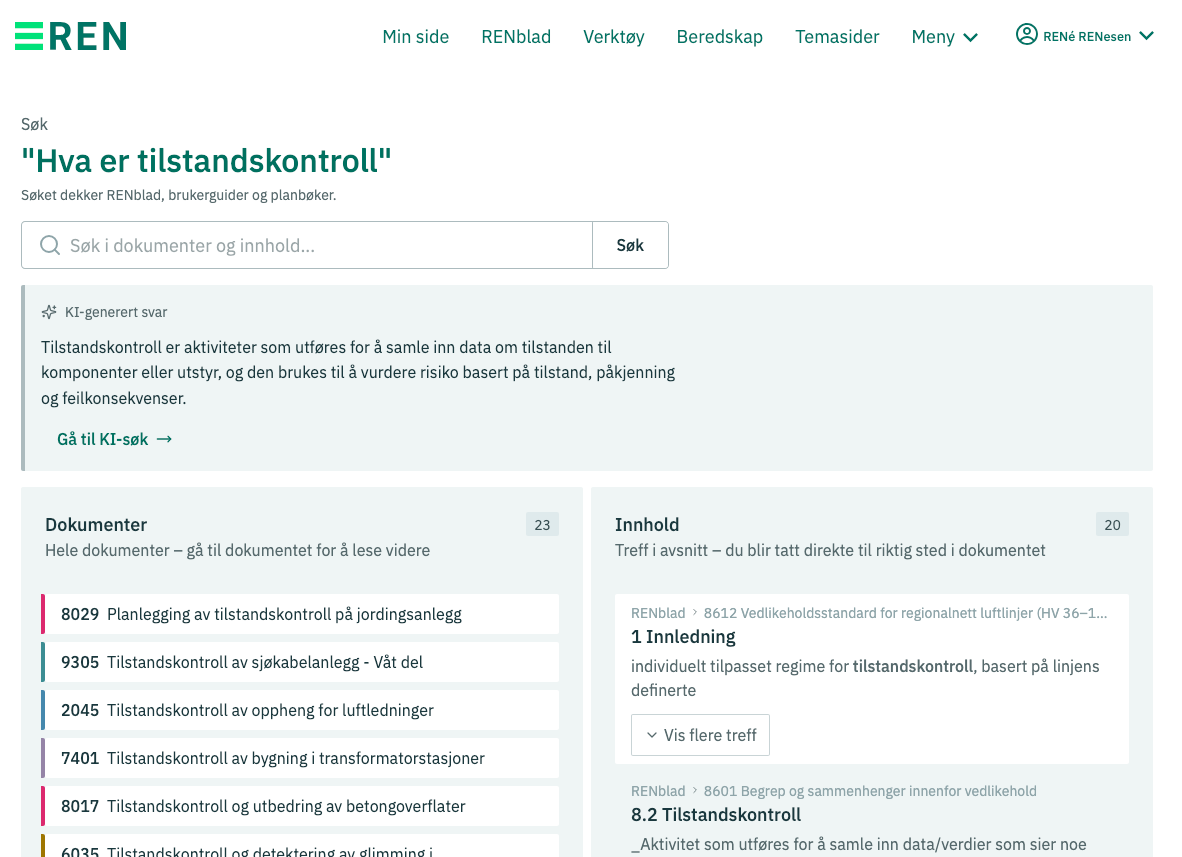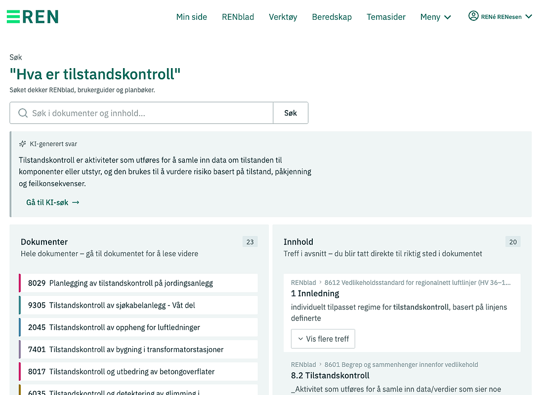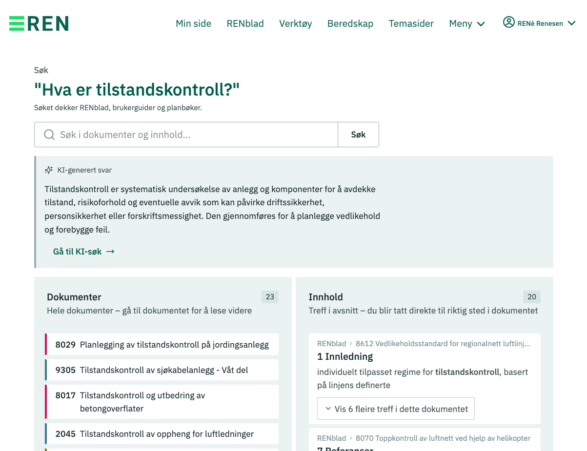 - KI-søk genererer et sammenstilt svar basert på innholdet i RENblad, Brukerguider og Planbok, med kildehenvisninger slik at du kan gå videre til originalkilden.