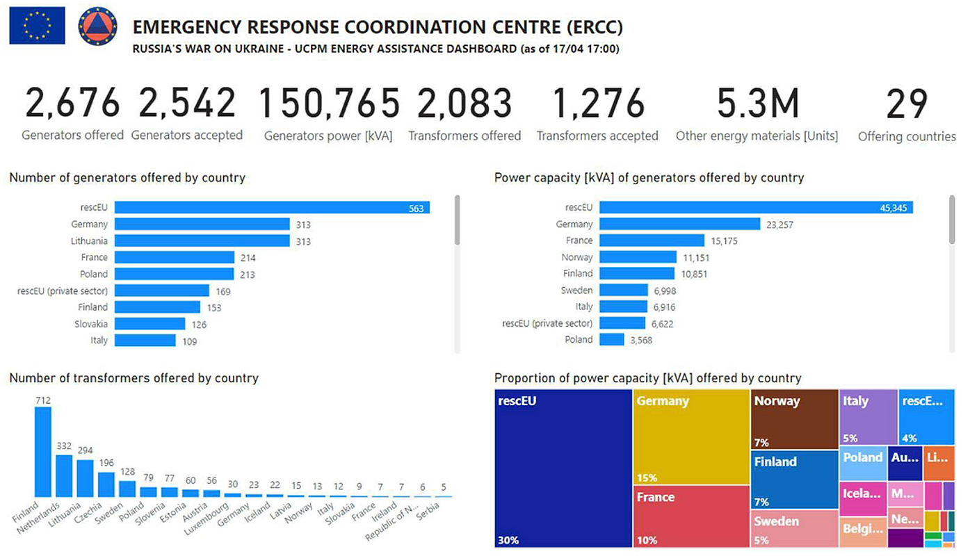 *I en intern NVE-oversikt er det pr uke 17-2023 donert generatorytelse rundt 27 MVA. I oversikten fra ERCC nedenfor er det oppgitt 11 MVA fra Norge. Den resterende ytelsen er inkludert under resEU , som er en sammenslutning av flere land (også Norge) Utstyr som videreformidles av rescEU blir ikke med i nasjonal statistikk.