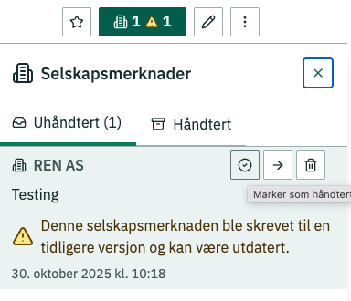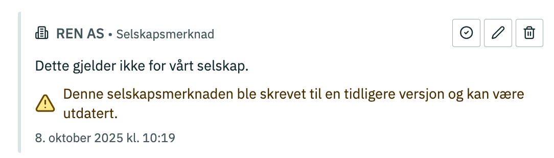 Merknadene i den nye versjonen blir markert som "uhåndtert" og får da teksten "Denne selskapsmerknaden ble skrevet til en tidligere versjon og kan være utdatert."