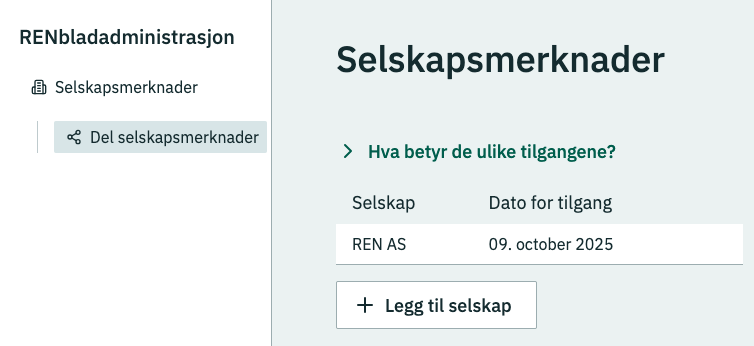Her REN.no/innlogget/renblad/administrasjon/selskapsmerknader/deling, kan man administrere deling av selskapsmerknader