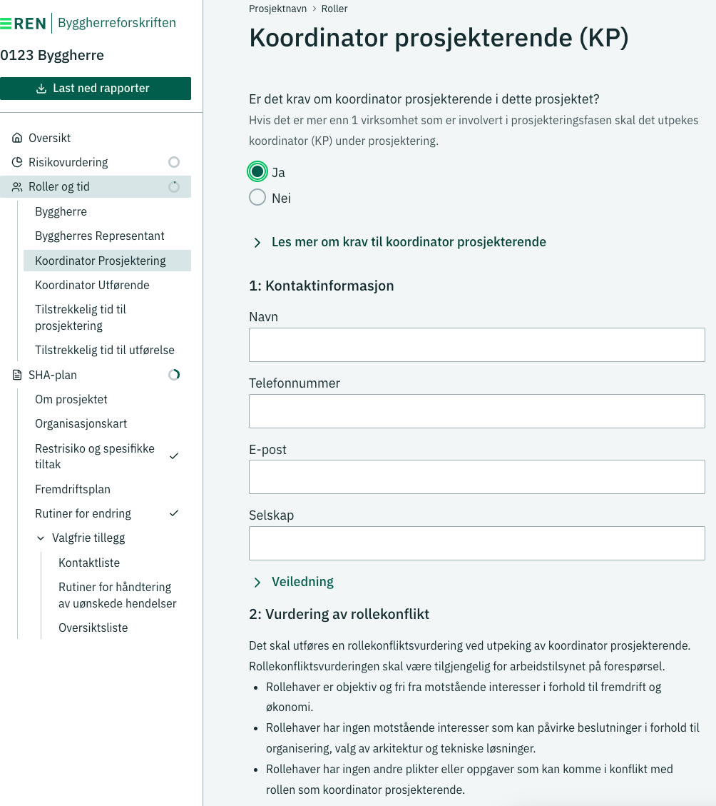 Risikovurdering: Byggherreforskriften krever at det en risikovurderer arbeidet som skal bli utført. Gjennomfør denne risikovurderingen direkte i applikasjonen. Spesifikke tiltak blir automatisk tatt med i SHA-planen.